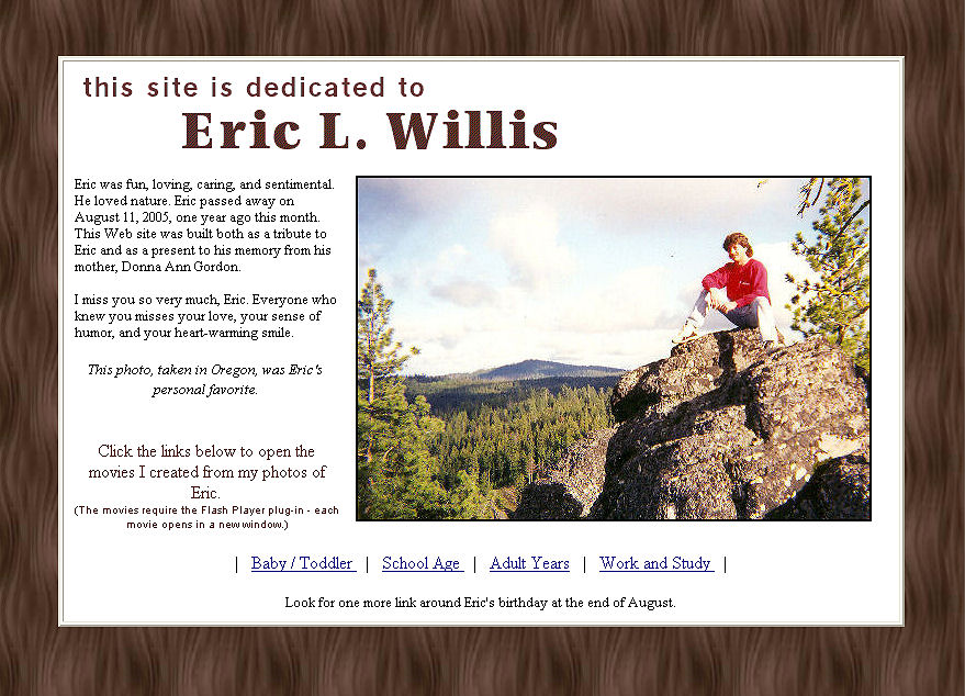 Memorial Site for Son Built in 2005 after my son Eric passed away. The site contains four Flash movies, created from numerous photos. http://www.ericwillis.info/