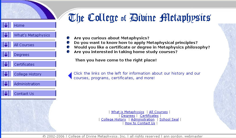 College of Divine Metaphysics Built to promote the correspondence courses offered by this school. I edited all the course materials, built the website, and started the online division. Now I am president of the school. http://www.divinemetaphysics.org/
