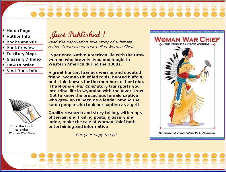 Woman War Chief Built this site to promote a Native American historical novel that I co-authored. http://www.womanwarchief.com/